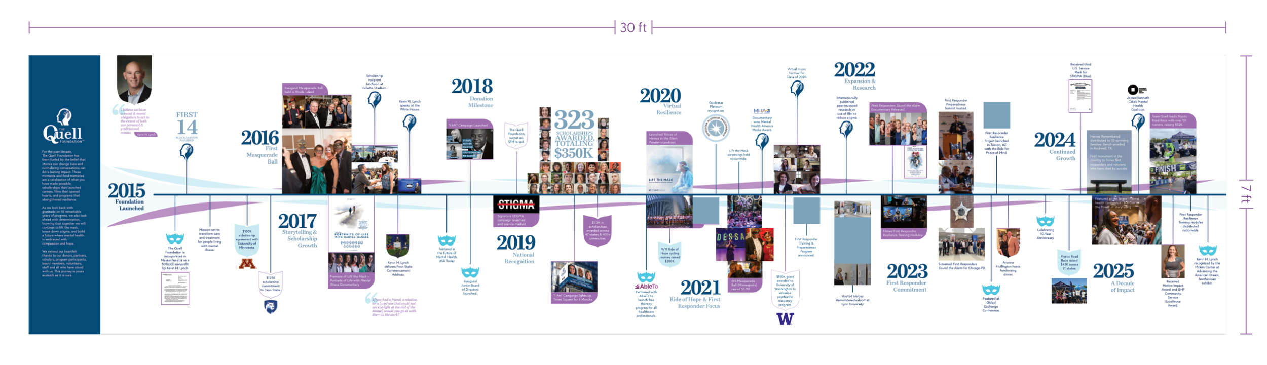 Working along side the Marketing Director, Ridwan Adhami, I developed a timeline celebrating the 10 year anniversary of The Quell Foundation. Across two weeks we compiled over 100 data points and close to 600+ photos into two 7ft commemorative walls honoring the rich history of this organization.